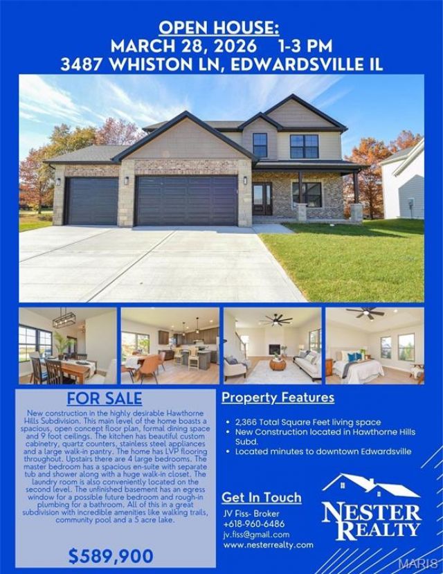 This single family home located at 3487 Whiston Lane, Edwardsville, IL 62025 is currently listed for sale with an asking price of $589,900. This property was built in 2025 and has 4 bedrooms and 2 full and 1 partial baths with 2366 sq. ft. Whiston Lane is located in the Hawthorne Hills Sub subdivision within the Edwardsville DIST 7 school district. Search Hawthorne Hills Sub real estate on mblomenkamp.strano.com today.